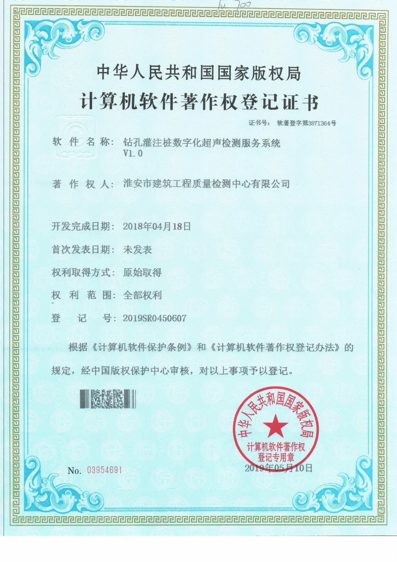 經(jīng)中華人民共和國(guó)國(guó)家版權(quán)局審核,淮安市建筑工程質(zhì)量檢測(cè)中心有限公司科研團(tuán)隊(duì)申請(qǐng)的《建筑檢測(cè)中心信息綜合管理系統(tǒng)》、《DG檢測(cè)業(yè)務(wù)管理平臺(tái)》、《地基基礎(chǔ)抗壓靜載試驗(yàn)系統(tǒng)》、《鉆孔灌注樁數(shù)字化超聲檢測(cè)服務(wù)系統(tǒng)》符合《計(jì)算機(jī)軟件保護(hù)條例》和《計(jì)算機(jī)軟件著作權(quán)登記辦法》的相關(guān)規(guī)定,被認(rèn)定為原始取得,并獲得國(guó)家版權(quán)局頒發(fā)的《計(jì)算機(jī)軟件著作權(quán)登記證書(shū)》。